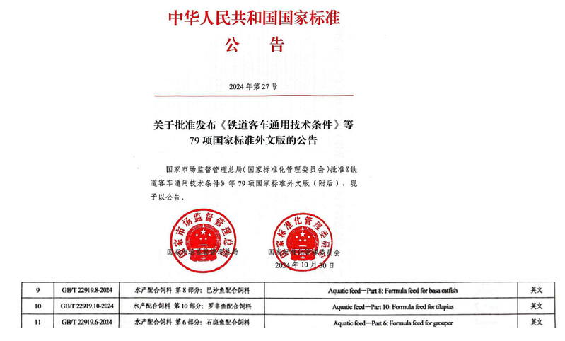 《水产配合饲料 第8部分:巴沙鱼配合饲料》(GB/T 22919.8-2024)的英文版《Aquatic feed-Part 8:Formula feed for basa catfish》,经国家市场监督管理总局(国家标准化管理委员会)批准,于2024年10月30日正式发布。该标准由国家标准化管理委员会主管,全国饲料工业标准化技术委员会归口,苏州大学为第一单位进行编制翻译,实验室吴萍、叶元土、成中芹3位老师为主要贡献者。
