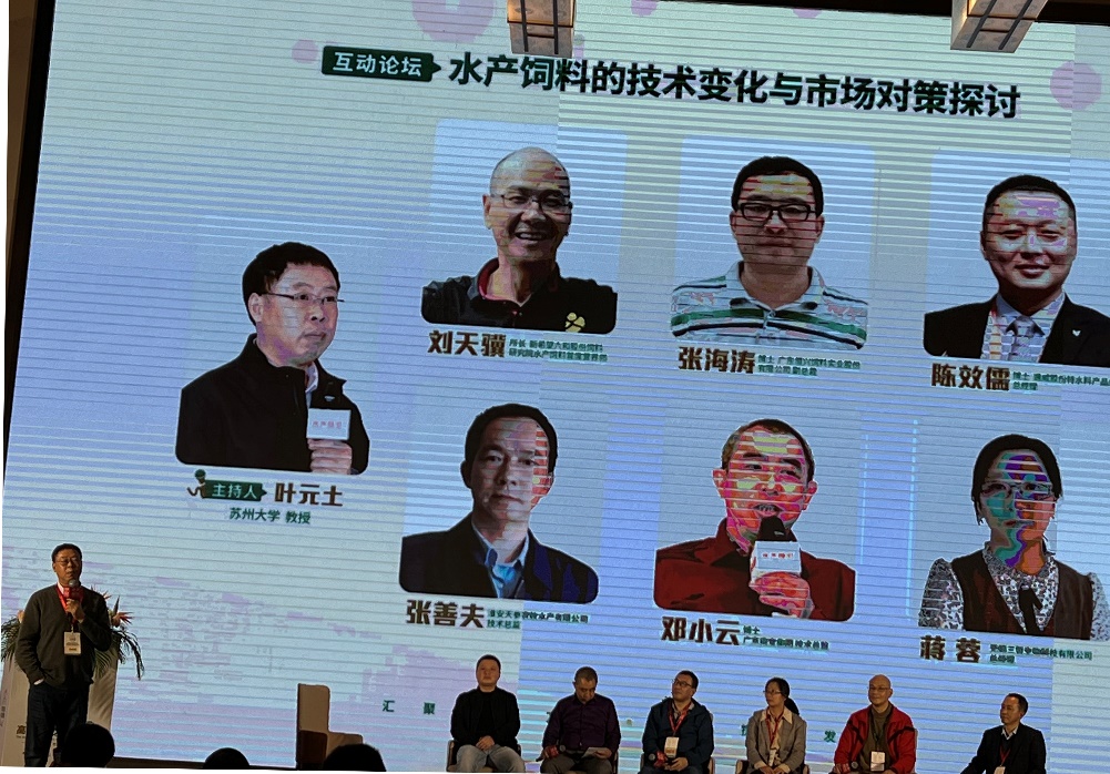 大会共设 “水产饲料的技术变化与市场对策探讨”和“水产食品产业生态系统中、水产食品产业链下企业的机会与发展” 两场互动论坛,由叶元土教授主持。本次交流互动环节围绕在当前激烈的市场竞争环境下,如何从食品端关注水产饲料的技术,目前企业面临着“不仅要把鱼养出来,还要把鱼端上桌”的竞争。饲料企业就保障水产饲料的质量将有何作为作出了热烈的讨论,多位饲料企业的董事长、总经理、副总裁或技术总监等参加了现场互动和解疑,并分享了企业的经验和担当;认为:饲料行业最终的落脚点是为人类提供安全的水产食品,这也是从业者的初心。实验室已毕业硕士:无锡三智生物科技有限公司总经理蒋蓉、广东省惠州市财兴实业有限公司总经理张伟涛、行业资深水产配方师张俊等以互动嘉宾的身份参加了本次交流活动。