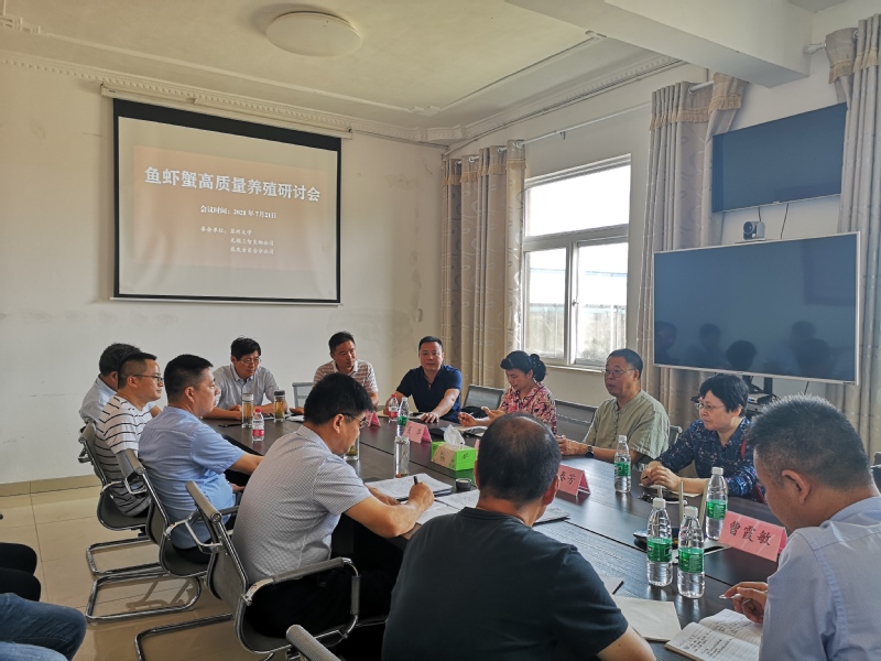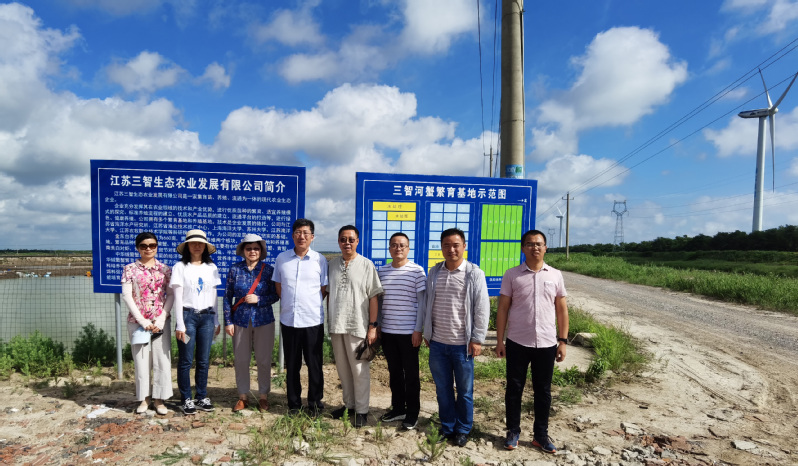 在无锡三智生物科技有限公司的河蟹苗种繁育基地,调研组查看了现场脊尾白虾的养殖状况,同时就河蟹育苗过程中的饵料成本、亲本大小、苗种产量、出苗周期等问题和场部技术员进行了深入探讨,对扣蟹培育中存在的问题进行了交流。