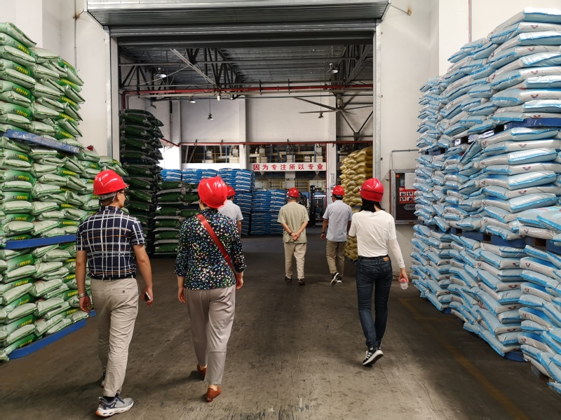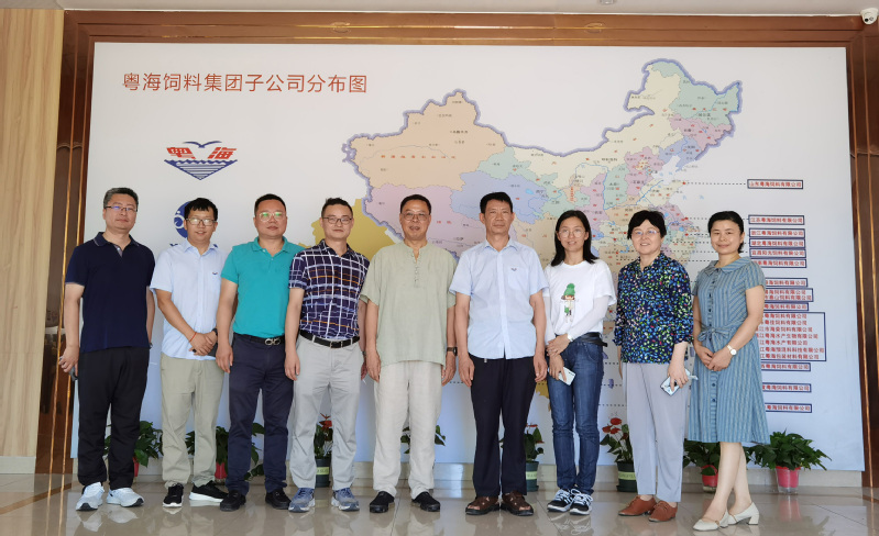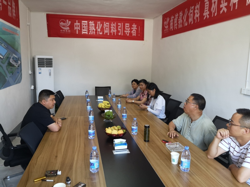 在江苏粤海饲料有限公司,调研组与公司总经理、技术总监等公司骨干进行了交流,了解了其产能、产值及生产的饲料种类,参观了生产车间,调研了多条饲料生产线,对当前饲料行业的走向作出了适当的研判,对水产饲料的质量把控提出了合理的建议。